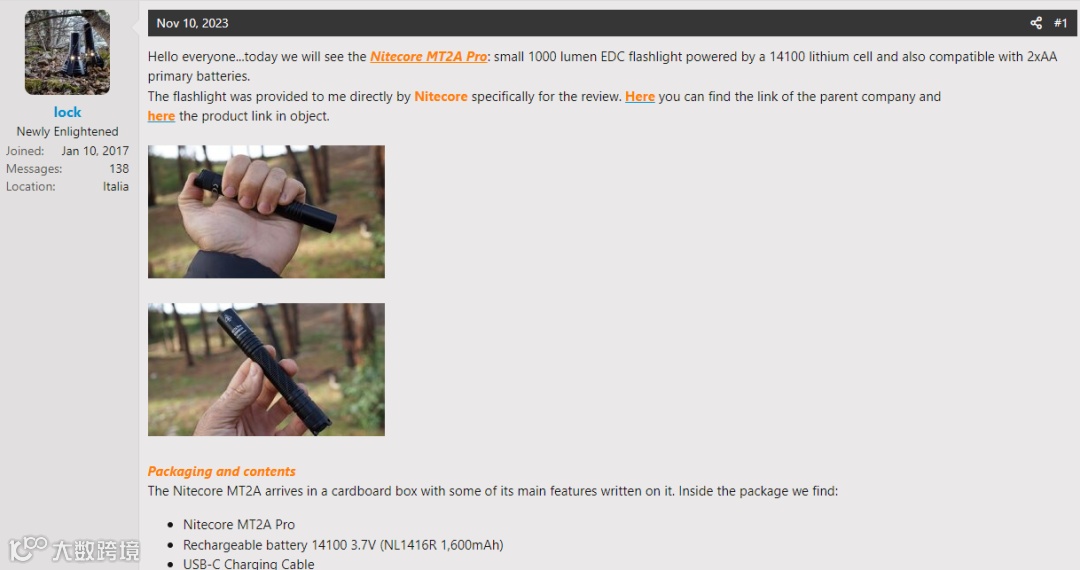 以品牌销量最高的MT2A Pro为例,2023年10月份发售。Nitecore选择投放了多家专业测评网站和照明垂直博客。每篇稿件都以真实上手评测为主,细致地从外包装开箱,外观设计和使用评价方面测试产品。同时由于手电筒的使用限制,全部稿件都从夜晚户外使用为切入点,详细测试其亮度和照明范围,给用户更真实地了解Nitecore,选择Nitecore。