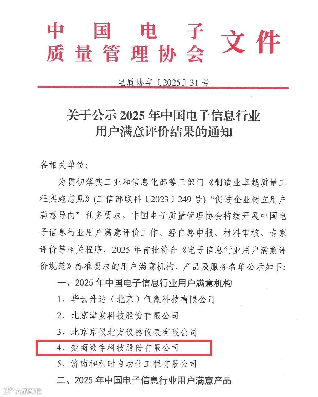 楚商数科获评