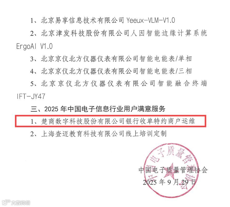 近日,楚商数字科技股份有限公司(简称“楚商数科”)凭借在银行卡收单特约商户外包服务运维领域的十年深耕,以及在技术创新与用户需求破解上的卓越表现,成功斩获“2025年中国电子信息行业用户满意机构”荣誉称号!这一奖项不仅是行业对楚商数科服务品质的高度认可,更是对公司以用户为中心、持续推动金融科技升级的有力肯定。