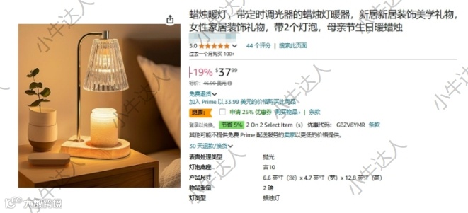 该产品于24年8月5日在亚马逊平台上架,(截至2024年9月4日)评分为5.0颗星,拥有44条来自买家的评论。在【蜡烛灯】商品排行榜中排名第67名。