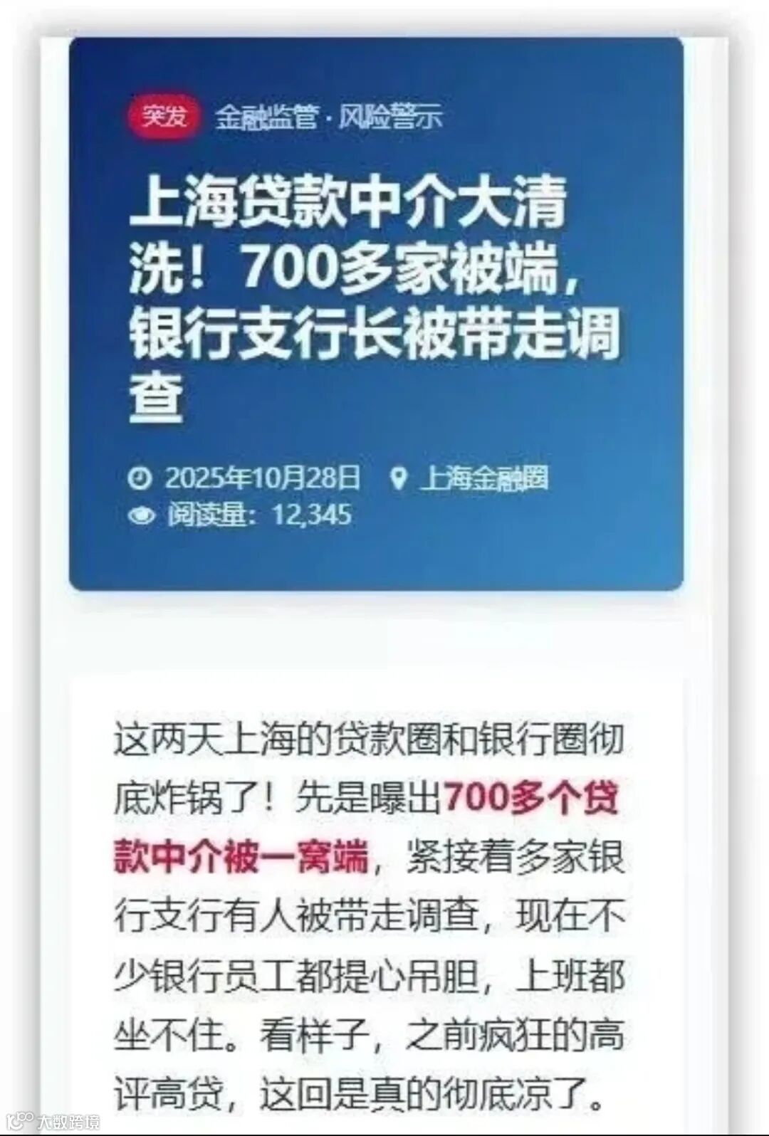 近日,上海贷款行业传来强烈震荡——数百家贷款中介被立案调查,多家银行员工被带走配合审查。一夜之间,整个圈子陷入沉寂:朋友圈广告消失,业务群无人发言,大量聊天记录被紧急清理。氛围的骤变,已说明一切。
