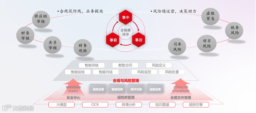 智能合规与风控平台以规则库管理为基础,具备规则设置、敏感词库管理、附件识别及违规设置等核心能力,以此为支撑打造智能审核、智能巡检、智能月结、数智合同、风险管理等中台服务。这些中台服务可进一步延伸至领域级合规及风控业务场景,形成共享审核、财务巡检、司库风险、税务风险、项目风险等风险管理应用。