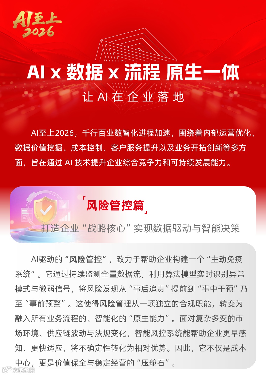 风险管理:通过灵活定义并识别经营全流程中的各类风险,推动风险管理从事后追溯转向事中监控与事前预防,达成企业各业务风险的统一可视、可控,目前,风险管理已衍生出 “资金舞弊及合规风险”“税务风险”“项目风险” 等多个领域的风险管控应用。