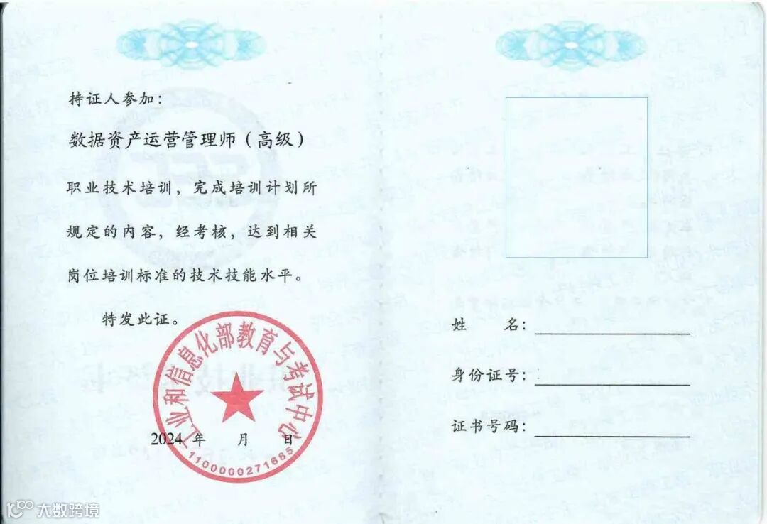 所有学员完成培训学时后,均可参加工业和信息化部教育考试中心规定的高级职业技术考核,通过后可申请由工业和信息化部教育与考试中心颁发的“数据资产运营管理师(高级)”职业技术证书。学员信息可在工业和信息化部教育与考试中心培训评价证书查询系统www.miiteec.org.cn查询。