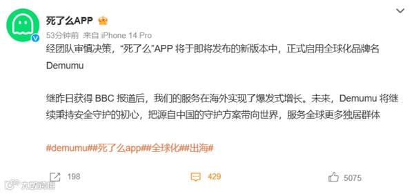 “死了么”APP官方宣布,即将发布的新版本将正式启用全新全球化品牌名——Demumu。