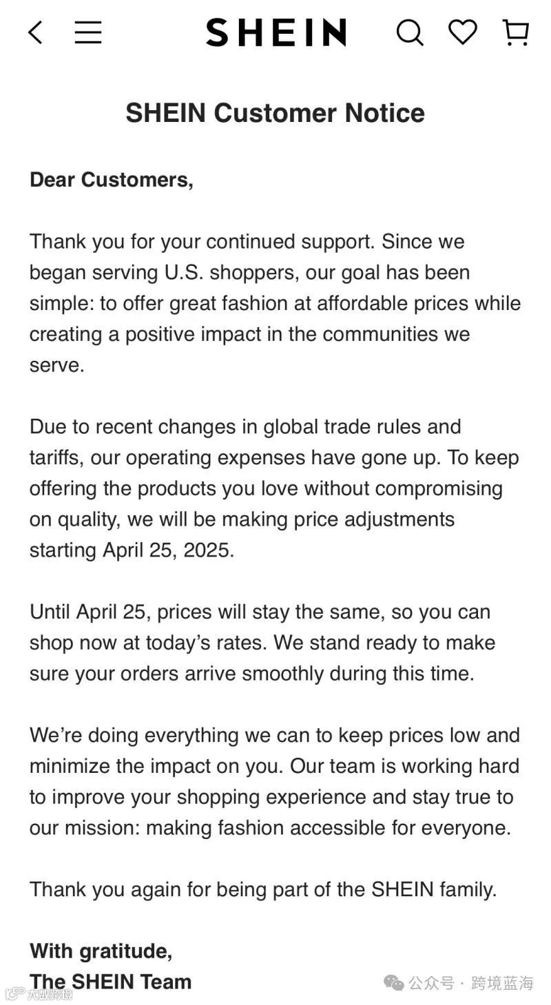 SHEIN通知:由于运营成本增加,为保证产品质量,公司计划从2025年4月25日起调整价格。在此之前,现有价格保持不变。