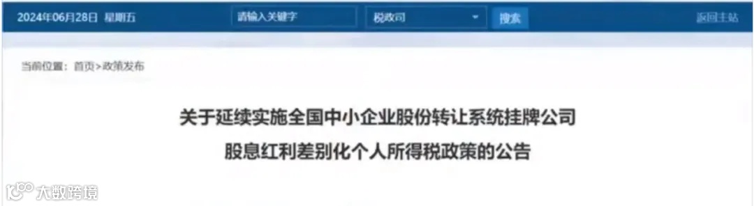 6月28日,财政部、国家税务总局发布《关于延续实施全国中小企业股份转让系统挂牌公司股息红利差别化个人所得税政策的公告》。