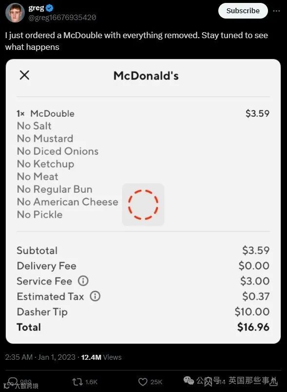 故事始于2022年12月31日,Greg出于调侃心理,在麦当劳App上下单一份双层芝士堡,但将所有配料——包括面包、肉、芝士、酱料等全部去除,最终订单变成一张包装纸。尽管如此,系统仍收取3.59美元餐费,加上服务费、税费及10美元小费,总花费达16.96美元。