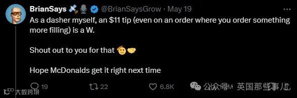 Greg随即在社交平台怒评麦当劳,但也明确给予外卖员五星好评,强调问题不在配送环节。不少网友对此事表示调侃:“20美元买个空气,很有道理。”也有外卖从业者留言称,11美元小费非常慷慨,值得点赞。