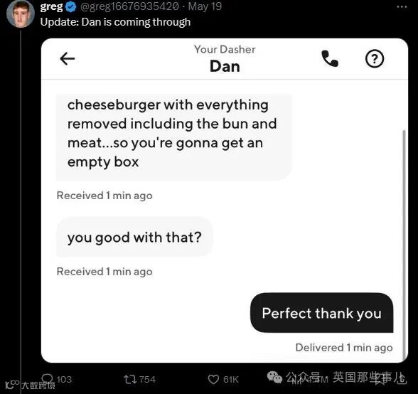 然而,外卖员接单后联系Greg称:“你的订单什么都没有,如果不说清楚要什么,我只能取消。”Greg回复:“我只要包装纸。”外卖员回应“真是浪费时间”,并联系平台客服,最终取消订单,费用原路退回。