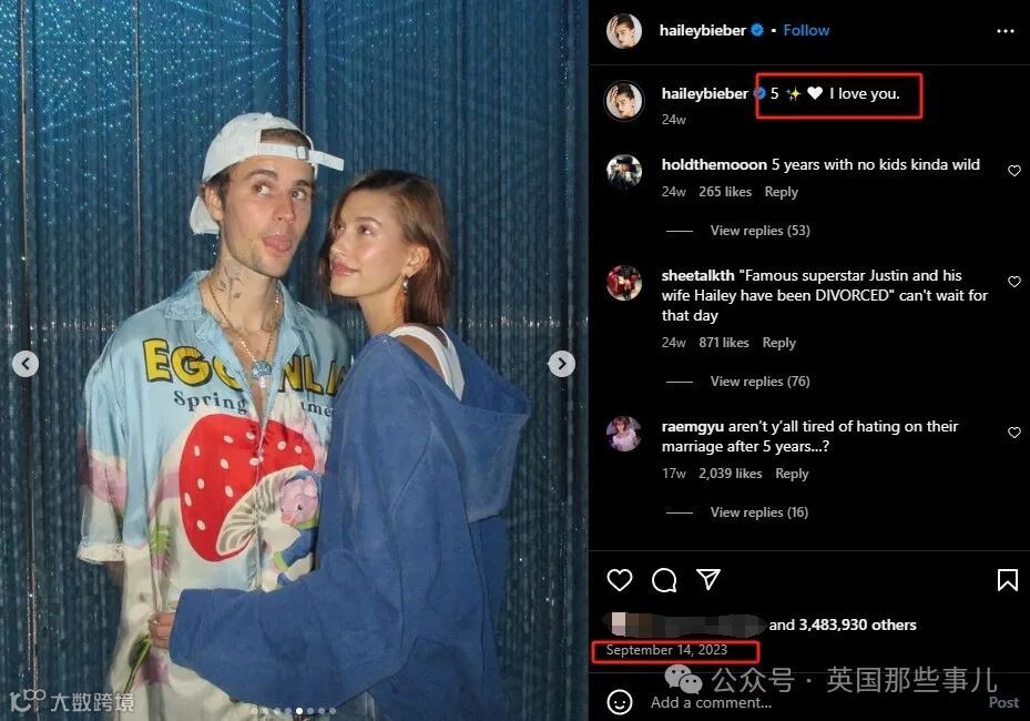 更有人翻出细节:海莉所发照片中,除生日蛋糕为新图外,其余多为旧照,甚至包括去年结婚五周年时用过的接吻照与合照,被指“凑数敷衍”。