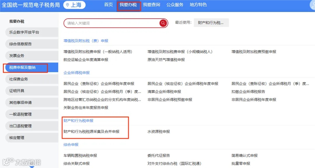 登录【电子税务局】-【我要办税】-【税费申报及缴纳】-【财产和行为税税源采集及合并申报】。