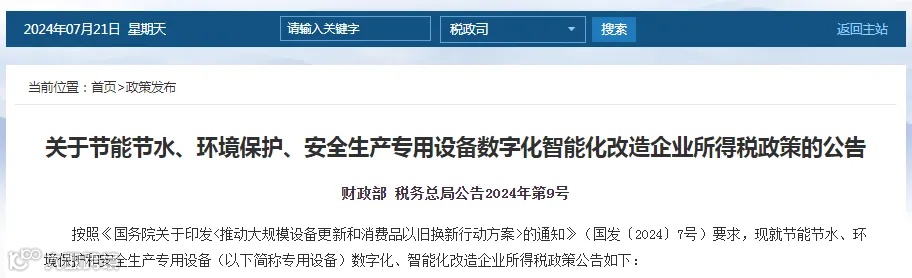 7月17日,财政部和国家税务总局发布《关于节能节水、环境保护、安全生产专用设备数字化智能化改造企业所得税政策的公告》。
