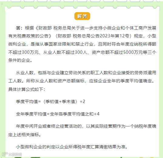 答:小型微利企业的判定以企业所得税年度汇算清缴结果为准,小型微利企业,是指从事国家非限制和禁止行业,且同时符合年度应纳税所得额不超过300万元、从业人数不超过300人、资产总额不超过5000万元等三个条件的企业。