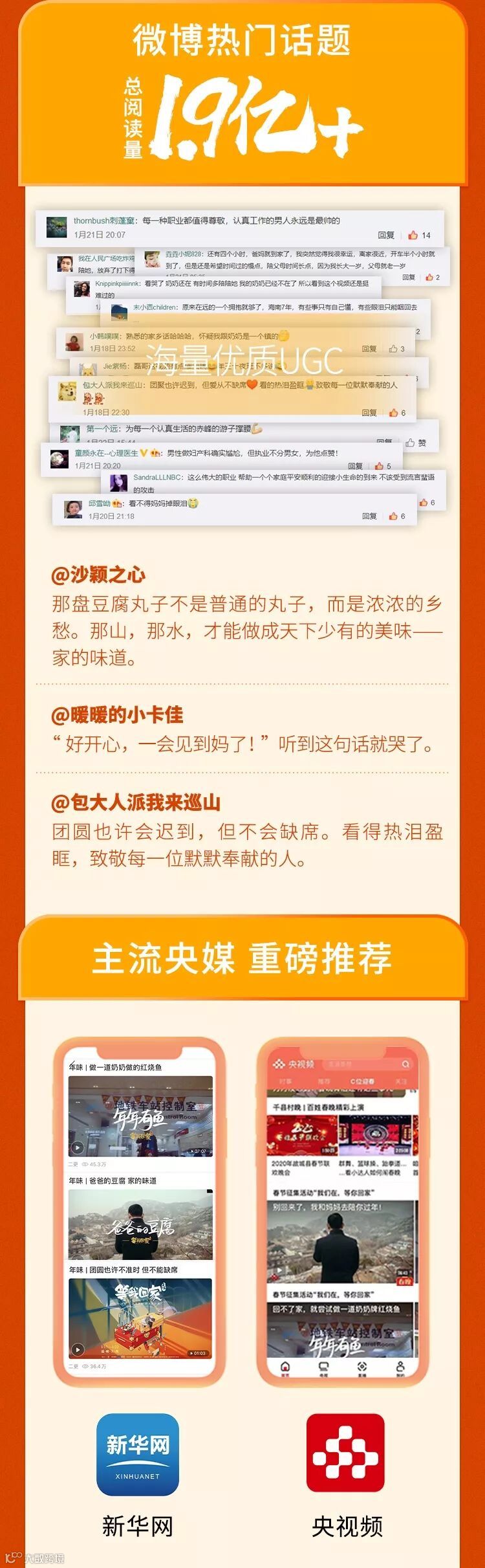 从《年味》系列第四季的播放量和互动数据可看出其成为跨界共赏的年味短片,既符合观众对于记忆中真实年味的需求,一句“等我回家”,对全民抗疫的氛围而言,也无疑是一股暖心的信念和信仰。网友在微博留言中写到,“团聚也许迟到,但爱从不缺席,看得热泪盈眶,致敬每一位默默奉献的人。”《年味》第四季基于三年的内容沉淀再出发,用五份不一样的团圆,让味道走胃更走心。