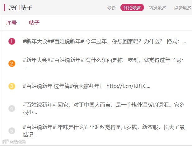 上线以来,“百姓说新年”系列微博话题排行榜占据第一位,社群用户讨论相关话题时,更喜欢聊“百姓说新年”的话题。