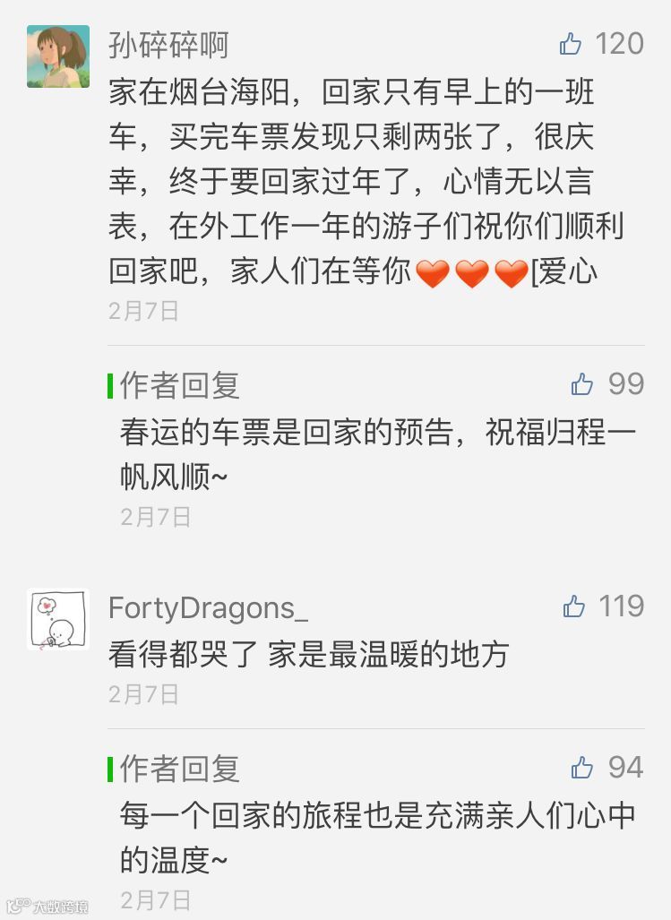 祖国的强大,交通的变化,让家离我们越来越近,曾经归途的辛酸如今变成了甜,乡愁不再遥不可及,而成了深扎在每个中国人心中的浪漫情怀。《过年》和《梦想》两篇视频播出后,粉丝们在评论区,讲述了一则则走心的故事。