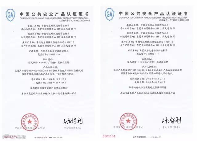 本次检测的顺利通过,标志着中控智慧在二代证行业的技术领先地位。至此,中控智慧已经有台式身份证阅读机具ID100、内置式IDM10和IDM30、台式二合一(“身份证”+“IC卡”)身份证阅读器ID180 、台式三合一(“身份证”+“IC卡”+“指纹”)身份证阅读器ID200、蓝牙型阅读器ID300等6款身份证阅读器产品通过公安部检测认证。
