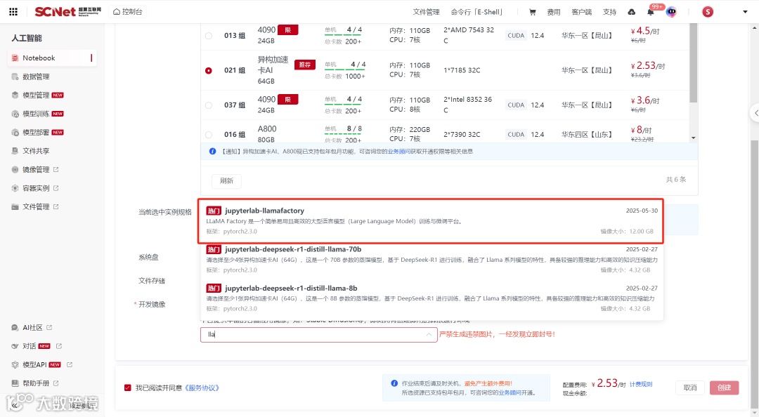 为降低用户环境搭建门槛,平台持续适配最新基座模型,开箱即用;同时提供预装LLaMAFactory等工具功能类镜像,支持界面化微调,加速创新应用落地。