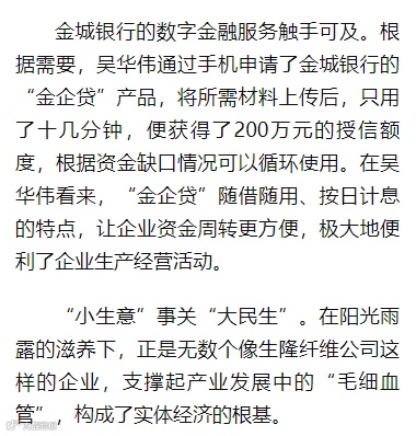金城银行的数字金融服务触手可及。根据需要,吴华伟通过手机申请了金城银行的“金企贷”产品,将所需材料上传后,只用了十几分钟,便获得了200万元的授信额度,根据资金缺口情况可以循环使用。在吴华伟看来,“金企贷”随借随用、按日计息的特点,让企业资金周转更方便,极大地便利了企业生产经营活动。