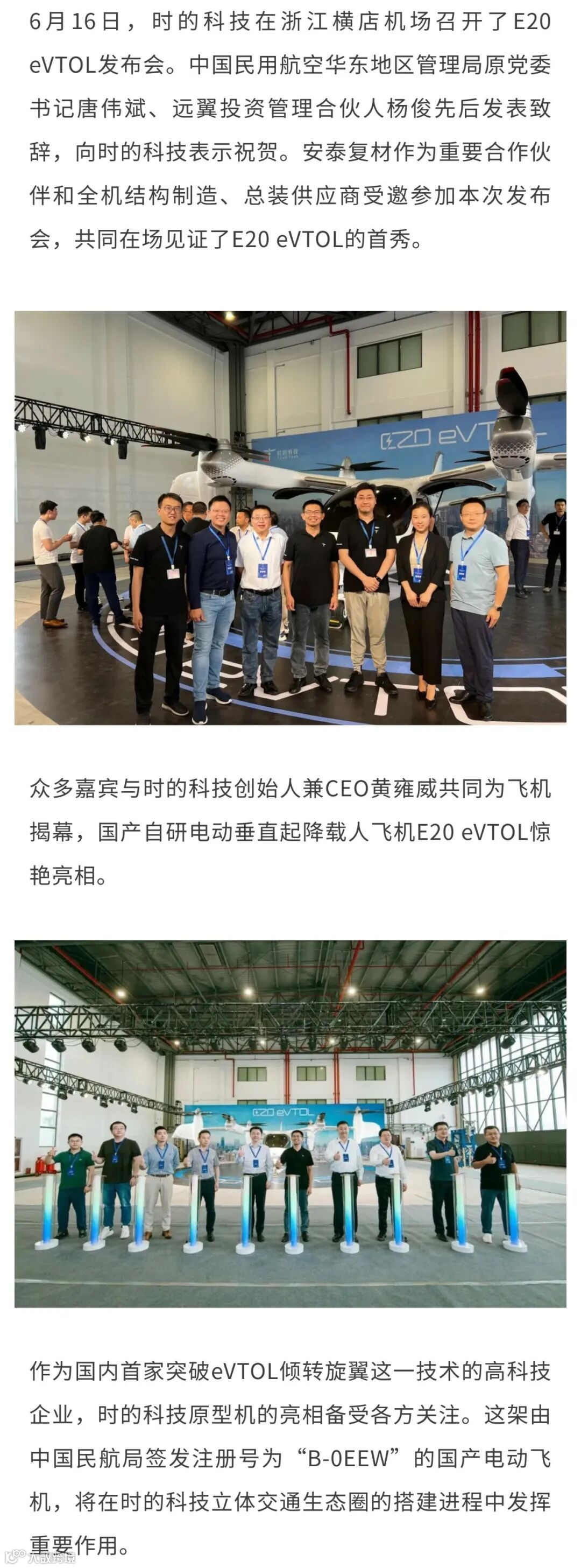 2022年9月,安泰复材正式参与时的科技大型垂直起降飞行器E20整机结构研制工作。为保障E20项目部件及总装工作顺利开展,安泰复材集合中德工程技术中心、科泰思(中国)及强华新材等技术骨干力量参与部件跟产,并与时的科技项目团队通力合作,充分发挥复合材料制造技术在行业领先的优势,凝聚全队的智慧和力量,勠力攻坚,成功突破多项关键技术,确保各项研制工作有条不紊,保质保量完成节点交付任务。