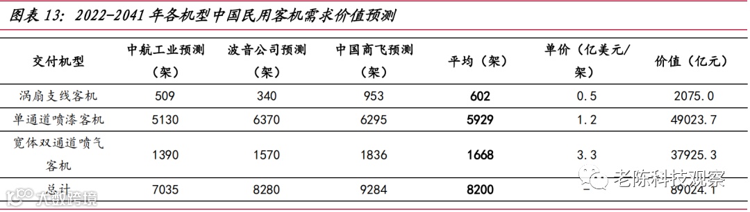 根据《中国商飞公司市场预测年报 2022-2041》中的交付价值,测算涡扇支线客机、单通道喷气客机、宽体双通道喷气客机的平均单价分别为 0.5 亿美元/ 架、1.2 亿美元/架以及 3.3 亿美元/架。测算未来 20 年中国新机交付市场总价值约 1.3 万亿美元,折合人民币约 8.9 万亿元(按在岸人民币兑美元 6.89 计算)。