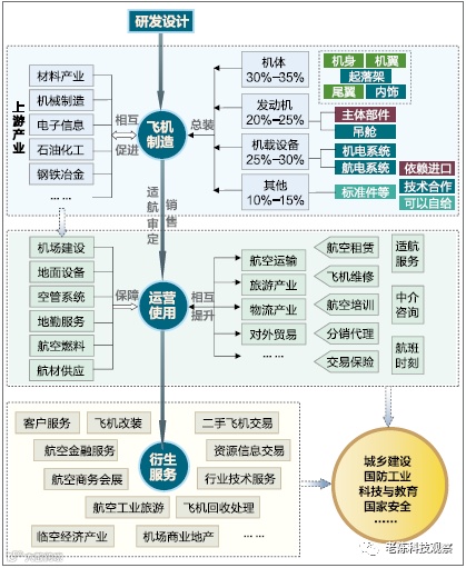 大飞机产业价值链是从研发设计到售后服务的一系列企业组成的价值链条。大飞机产业价值链分布特征为:位于前端的研发设计、发动机制造、关键零部件制造属于资金和技术密集型,具有较高的附加值;位于后端的营销、售后服务属于管理和信息密集型,附加值也较高;中间的一般零部件制造、整机组装环节属于劳动密集型,附加值较低。