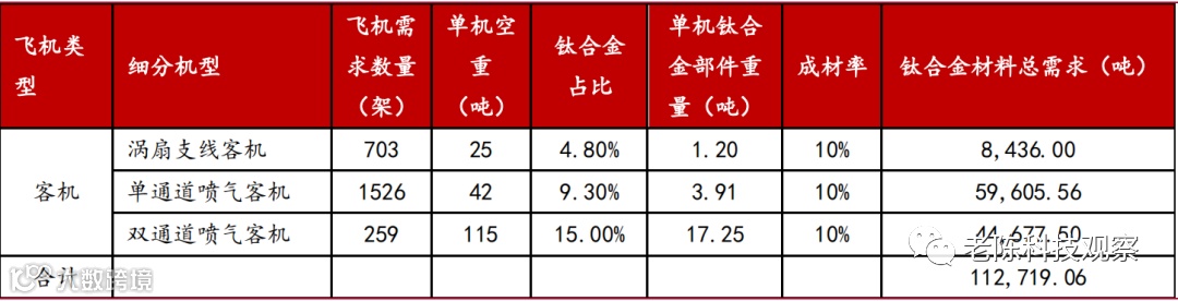 钛合金市场需求:根据《航空钛合金的应用与发展趋势》的描述,ARJ21、C919、 CR929 用钛量分别为 4.8%、9.3%、15%。假设以 ARJ21/C919/CR929 钛合金占比 4.8%/9.3%/15.0%,钛合金部件成材率以 10%进行测算,未来 20 年国产民用客机市场钛合金材料总需求约达到 11.3 万吨,年均约 0.6 万吨。