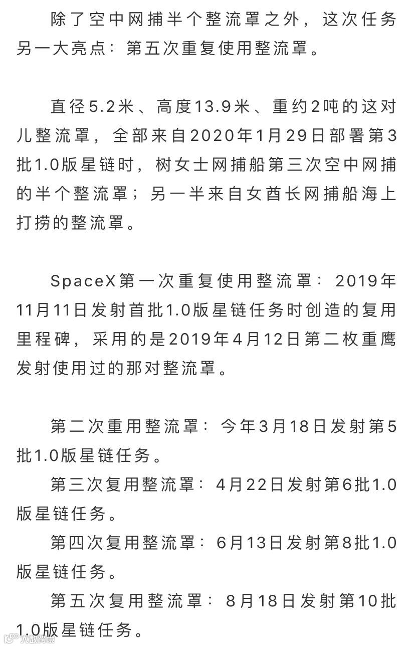 2020年6月3日发射第7批1.0版星链(Starlink-7 V1.0),总计部署482颗,在轨操作477颗。SpaceX首度创下「一箭五飞五回收」