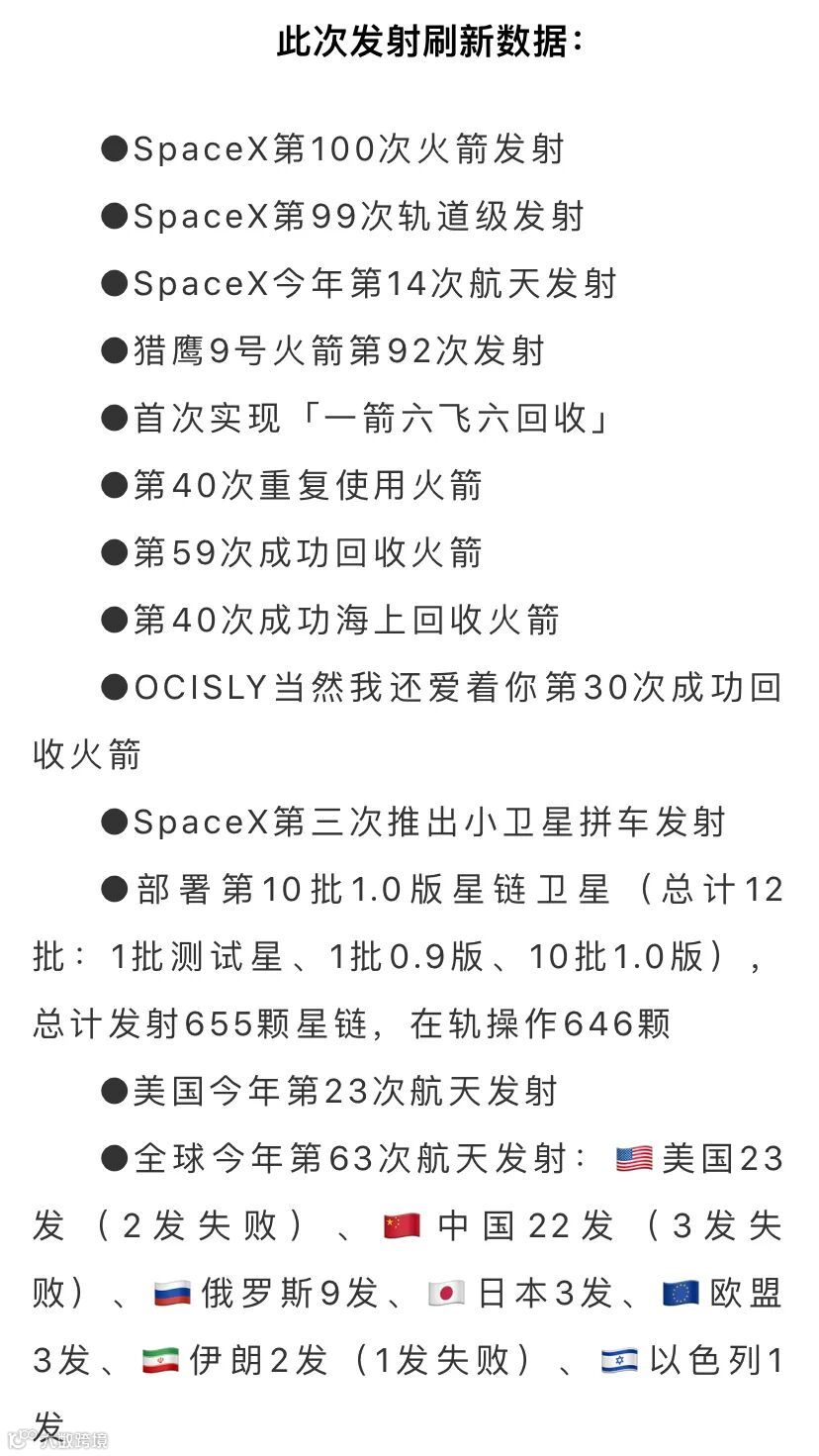 ▲大约升空8分42秒,第六次穿行天地间的这枚一级火箭成功挑战「一箭六回收」,稳稳降落在回收最多火箭的【当然我还爱着你】海上平台上,由此创下首次「一箭六飞六回收」创举,刷新全球航天复用回收新纪录。