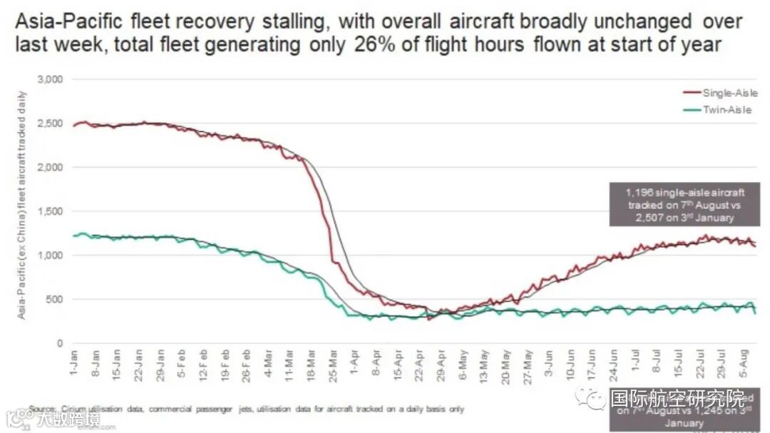 在除中国以外的亚太地区,截至8月7日,与疫情前相比有48%的窄体机和37%的宽体机恢复运营。
