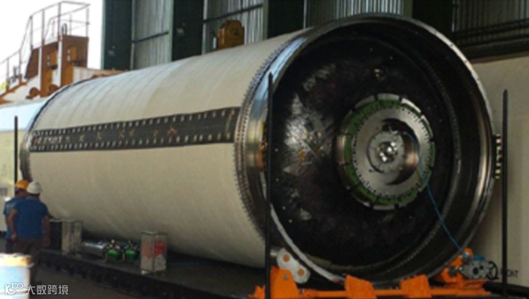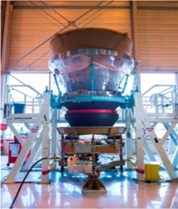 壳体采用碳纤维复合材料、干法缠绕工艺制成,年产量预计为35-36台,尤其是开发了基 于其专利树脂系统HEX23©的预浸材料(特点是贮存时间长,室温条件下达6 个月;具有高热-力学性能,玻璃转化温度约170℃),提高了 带浸渍参数,以利于自动铺带机进行铺放。发动机壳体力学试验采用专门设计和建造的模拟空间发射条件的平台进行,包括燃烧室内增压、 发动机推力和由运载火箭工作阶段产生的力学荷等测试。发动机壳体经历了直至最大发动机工作压力的测试循环和一系列轴向载荷循环。下图为用于惰性地面试验的第一台P120发动机壳体,在位于意大利科莱费罗的艾维欧工厂完成。