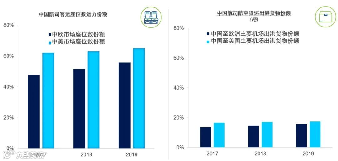 过去两三年间中国航空公司在中欧和中美客运市场客运市场的份额都有很大的发展,超过了50%,甚至到了60%以上。但他们在中欧和中美客运市场货运市场的份额从目前来看还是比较低的。这也预示着,随着市场的发展,中国航空公司在这些国际远程货运市场上有更大的发展空间。