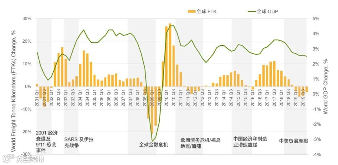 本世纪初的2001年以来,全球年度货运量的变化与GDP的变化基本吻合。当经济受到911袭击、金融危机等重大事件冲击时,航空货运也会受到负面影响。而每次危机之后的两三年,航空货运就会和经济一起复苏,显示了其强劲的韧性,并随着经济增长进一步增长。