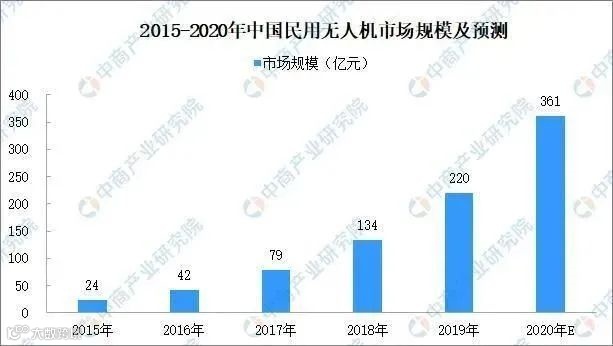 据数据显示,2015年中国民用无人机市场销售规模达到24亿元。随着无人机应用领域的逐渐扩大,无人机市场需求逐渐提升,2018年突破100亿元大关达134亿元,2019年市场规模约为220亿元。国内民用无人机市场潜力十足,预计2020年市场规模将超360亿元。