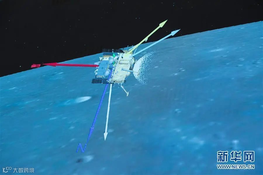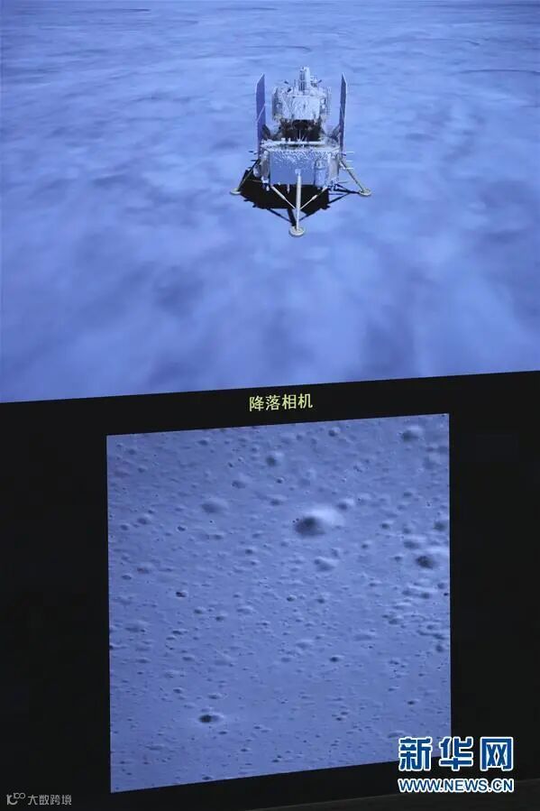 期间,探测器进行快速姿态调整,逐渐接近月表;此后进行障碍自动检测,选定着陆点后,开始避障下降和缓速垂直下降,平稳着陆在位于月球正面风暴洋的吕姆克山脉以北地区。着陆过程中,着陆器配置的降落相机拍摄了着陆区域影像图。