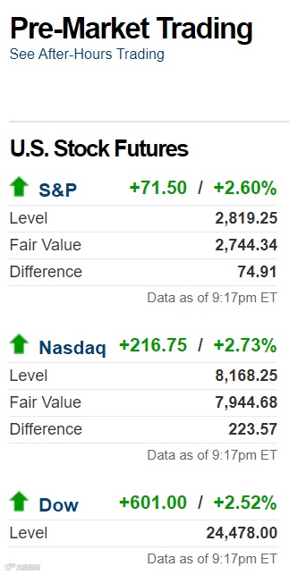 白宫的“救市口号”取得初步成果,截至发稿,三大股指期货盘后涨近3%。