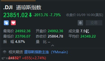 最终,道琼斯工业指数深跌2013.76点,收23851.02点,就跌去点数而言,创下历史纪录,同时录得跌幅7.79%,百分比跌幅为2008年10月以来最大;标普500指数跌225.81点,跌幅7.6%,收2746.56点;纳斯达克综合指数跌624.94点,跌幅7.29%,收7950.68点。后两个指数的单日跌幅,均创2008年12月以来纪录。