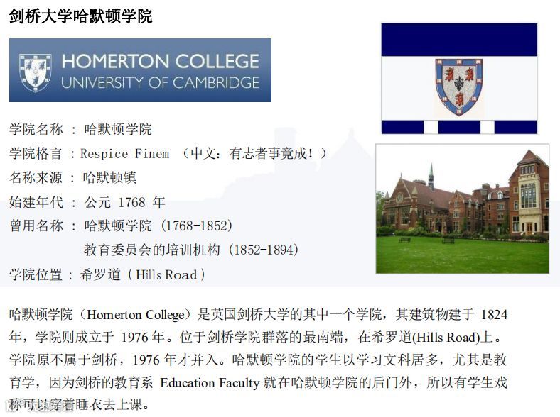 英国剑桥大学简介:剑桥大学(英语:University of Cambridge;勋衔:Cantab)为一所坐落于英国剑桥市 的研究型书院联邦制大学。剑桥为英语世界中历史第二悠久的大学,剑桥大学和牛津大 学(University of Oxford)齐名为英国的两所最优秀的大学,与牛津大学常获合称为 「牛剑」。剑桥大学是多个学术联盟的成员之一,亦为英国「金三角名校」之一及剑桥大 学医疗伙伴联盟,并与产业聚集地硅沼的发展息息相关。剑桥大学是世界上最古老的大学和 领先的学术中心之一,也是自治的学者小区;其卓越学术成就,声誉于世界闻名,反映了学 生的智力成就,以及大学和学院的员工进行世界一流的原始研究。英国剑桥大学是世界最古 老的大学之一,有 800 多年的历史,是诞生最多诺贝尓奖得主的高等学府,有118位诺贝 尔奖获得者,4名君主,15名英国首相,30多位总统或总理等,11 位菲尔兹奖得主,6 位图灵奖得主,许多蜚声全球、知名遐尔的著名科学家、经济学家、政治家、哲学家均诞 生此校。剑桥大学还是英国的名校联盟「罗素集团」(Russell Group of Universities)和 「欧洲顶尖大学科英布拉集团」(European-wide Coimbra Group)的成 员。剑桥大学在众多排行榜中,均在十强之列,并经常与牛津大学争夺「全英最佳」之名誉。其中,泰晤士的《世界声誉排名》自 2011 年创办以来,一直将剑桥列作全球前 四。个别学科方面,其则以数理见长。享有高度自治权的书院则属私立机构。它们有自 己的管理架构、收生以及学生活动安排,工作有别于负责教研的大学中央。各学院通常独 立运作,就像一所小型大学。剑桥大学的研究实力亦获得多个组织的认可。英国研究评核 调查(RAE)在2001 年及 2008 年将剑桥列作全英第一。2005 年《卫报》报告指,剑 桥培养的博士生的数量为全英高校第一,比位列第二的牛津大学多出 30%。