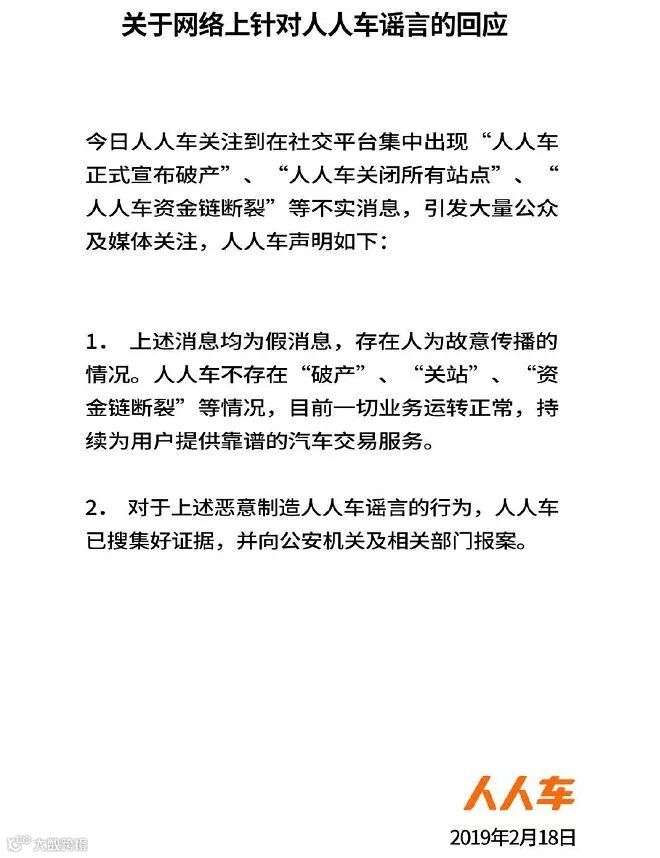 消息一出引来许多网友的转载评论,人人车马上发布有关“破产”、“关站”、“资金链断裂”的回应公告,称目前一切业务运转正常,请不要信谣传谣”的公告,但依旧抵御不住舆论的大面积扩散,毕竟广大网友可并不买账。