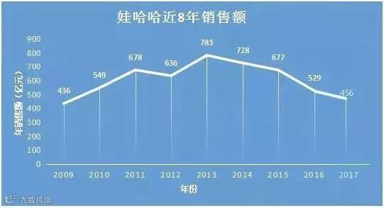 然而,经过多年的岁月洗礼,曾经盛极一时的娃哈哈帝国现在逐渐呈现颓态。最近几年,随着人们消费观念的改变,以及零售领域新格局的形成,娃哈哈虽然还在不断地推出新品,但是成效似乎不尽人意:公司销售额在2013年达到巅峰值——783亿元以后,一路下滑至2017年的456亿元,短短5年暴跌40%!