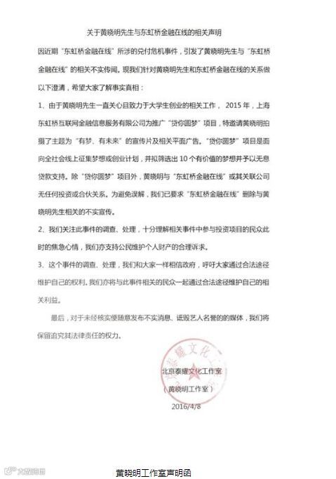 两年前东虹桥在线、魔环电影等与“关联”的多个互联网金融平台出现逾期,并确认了东虹桥目前正在清盘的事实!影视演员黄晓明在2015年被邀为其代言过,引得不少投资者跑到他微博下去诉苦。2016年4月8日,黄晓明的工作室急忙公关,称黄晓明致力于大学生创业,因该金融公司有“贷你圆梦”这个项目,当时只是去帮忙拍相关广告,事件才得以平息。