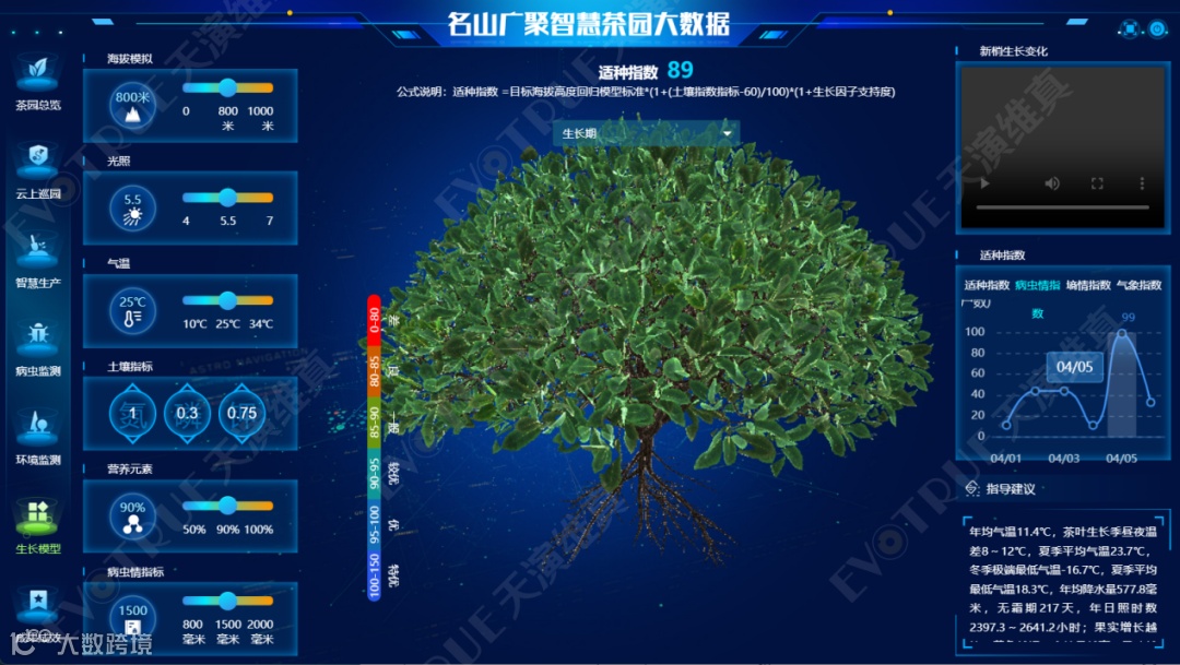 名山广聚茶园智脑通过整合多样化数据构建模型,以支持茶叶采摘期预测、生产指导、病虫害防控等任务。全面监测农事农情,提供科学农事指导和农技推广,精准应对病虫害威胁,并建立品牌与溯源体系,维护品牌形象,确保产品质量与安全。并系统梳理生产、加工、营销与服务资源,洞察产业现状,为茶园管理提供精准决策支持。同时,注重保护生态环境,预警风险,有效控制自然灾害以及病虫害,提高防灾减灾处理效率。此外,通过线上线下管理服务相互结合,提升数字茶园综合管理水平。