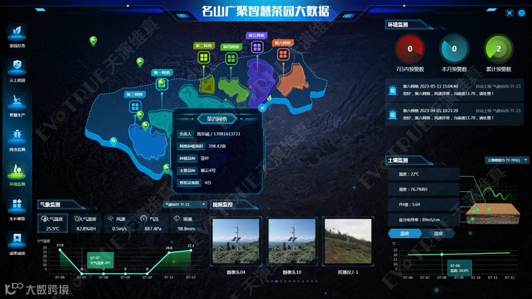 名山广聚茶园智脑主要涵盖茶园概括、云上巡园、智慧生产、病虫监测、环境监测、生长模型、成果成效等七大板块。在茶园总览板块中,将茶园概况、茶园配置、生产概况、种植品种、生产经营情况等产业数据上图,通过数据智能分析全面掌握产业发展情况,实现以图管农,以图管地、以图防灾的数字化创新管理模式,为政府决策,职能部门管理提供“一站式”支持,赋能指导和决策。同时,把茶园划分成5个网格,建立台账,记录人员档案、品种档案、设备档案,全部实行网格化管理,能够精准掌握每块茶园的管理状况。