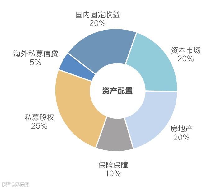 以1亿元资产为例,宜信财富建议投资者将25%的资产配置到私募股权、20%配置到房地产、20%配置到国内固定收益、20%配置到资本市场、5%配置到海外私募信贷、10%配置到保险。具体配置策略如下图所示: