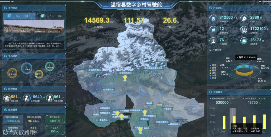 另外,建设数字乡村驾驶舱,包括 4 个试点乡村数字驾驶舱和 1 个数字乡村大数据中心数据管理后台,主要围绕乡村振兴中的美好乡村、红色先锋、产业兴旺、生态宜居、乡风文明、治理有效和生活富裕等内容,以数据一张图的形式呈现,助力乡村智慧治理。