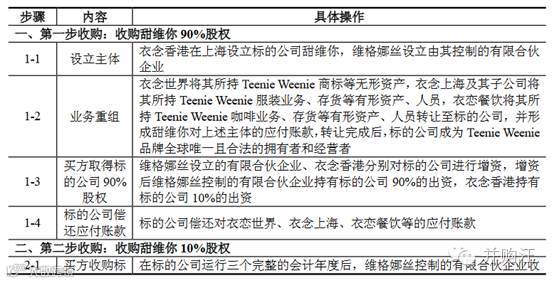 本次交易大约分两步。第一步,交易对手依恋香港(依恋世界集团的子公司)及其关联方分别将所持有的Teenie Weenie 品牌及该品牌相关的资产和业务转让至标的公司(甜维你)。