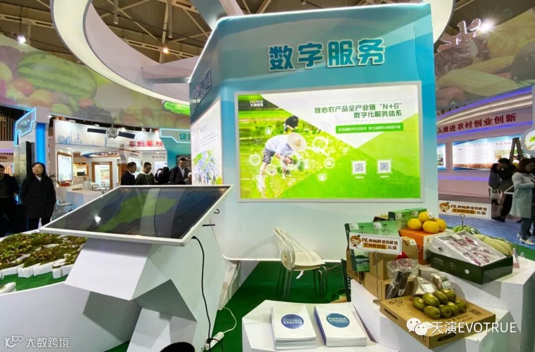 本次博览会,天演维真重点展示了区块链数字化云技术助力品牌农业转型升级的典型案例,即衢州放心农产品全产业链“N+6”数字化服务体系建设模式。现场通过大数据平台展示、VR全场景展示、区块链技术应用产品体验等板块设置,打造技术服务与实践成效相结合的情景式展台。