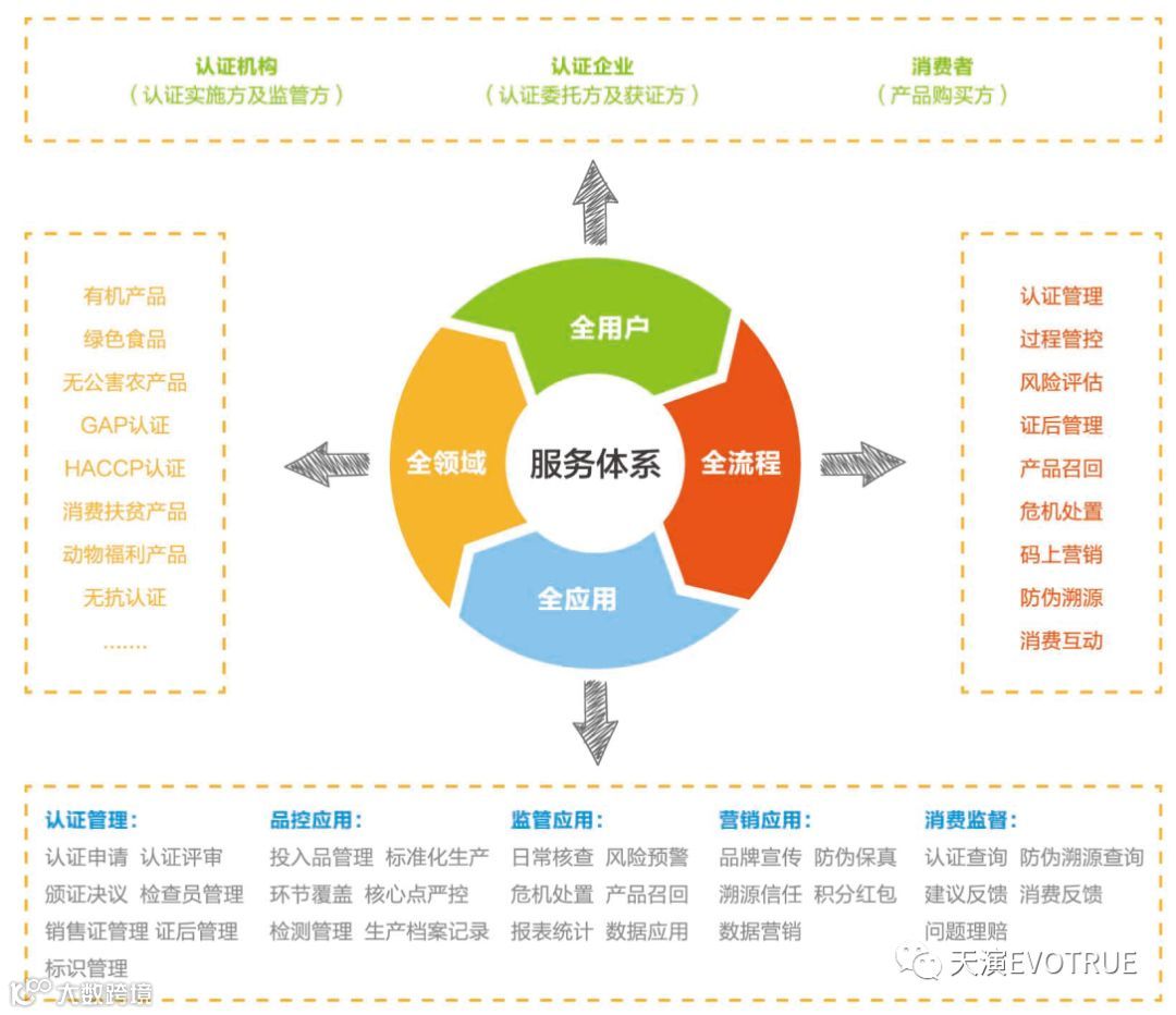 天演维真农食认证综合服务体系,为各认证机构和企业提供认证管理、证后监管、产品追溯与监管、标签管理与查询全流程信息化服务,涵盖有机产品、绿色食品、无公害农产品、GAP认证产品、无抗认证产品等多种农食产品认证。