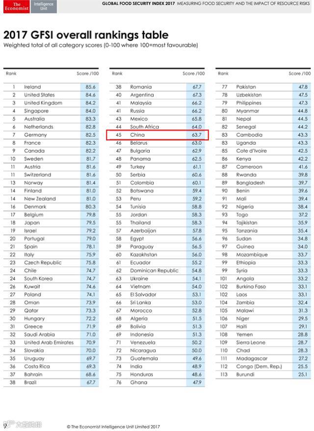 ▲ 2017年《全球食品安全指数报告》整体排名